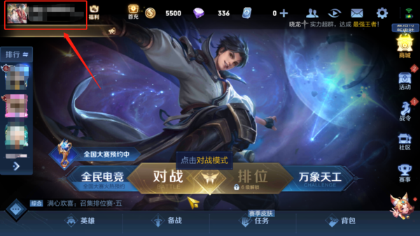 步骤一:在电脑上打开王者荣耀电脑版后,点击页面左上角的个性信息栏。