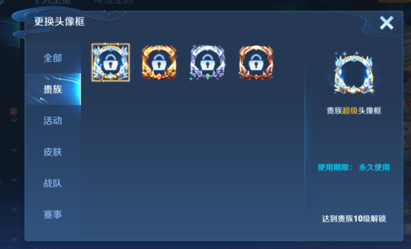 不过要注意的是,想要更改头像框的话,除了系统初始的头像框之外,其他头像框需要达到一定的贵族等级,或者是参与活动以及购买皮肤时赠送得到,才能自由永久的使用。