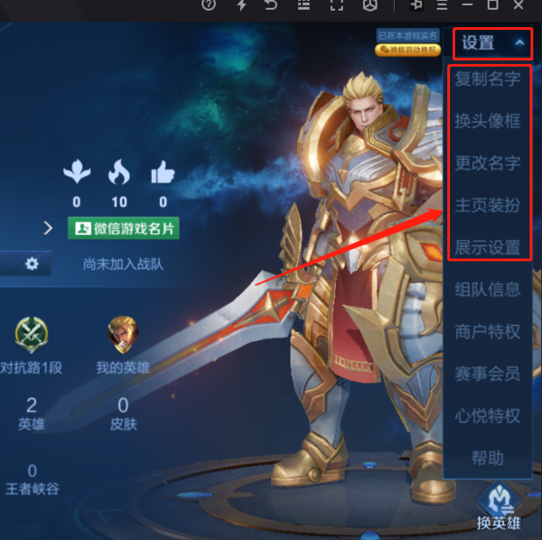 同样是在王者荣耀电脑版的个人主页中,玩家可以点击右上角的设置键,来选择更换头像框或者是名字等信息。