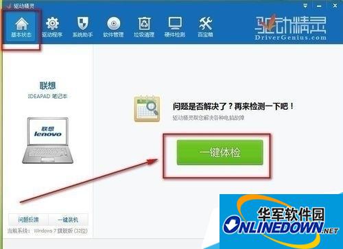 1、打开2015驱动精灵,在基本状态页面中点击【一键体检】。