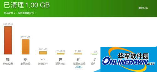 8、最终清理工作完成,提示共清理1G控件的垃圾文件,同时可以看到垃圾中各类文件所占据的比例。