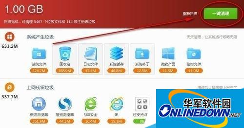 5、扫网完成后提示扫描出的垃圾文件数量和注册表垃圾数量,点击【一键清理】。
