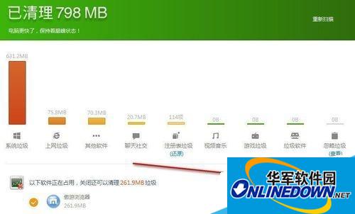 7、上述垃圾清理完成后,如果有占用系统垃圾的软件正在运行中,还会提示要求将对应的软件【关闭并清理】,点击继续执行清理。