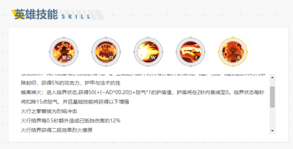 5、焕离神火。进入临界状态,获得一定量护盾值,护盾将在2秒内衰减至0。临界状态每秒将扣除15点怒气,且会让上述部分技能转换状态。