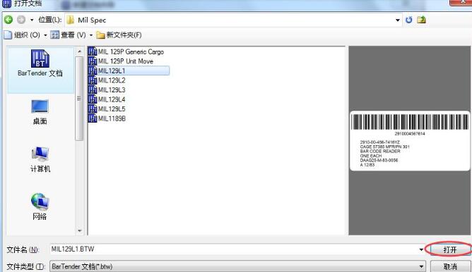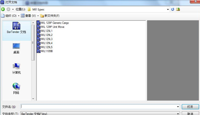 2. 选择“现有BarTender文档”,按“选择...”;在弹出的“打开文档”对话框中左侧的快捷方式导航栏中,点击BarTender文档位置;
