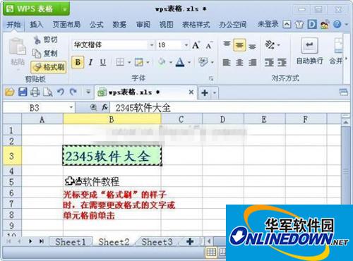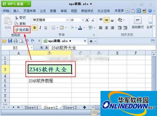 首先选中“2345软件大全”所在单元格,然后点击菜单栏中的“格式刷”按钮;