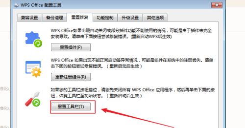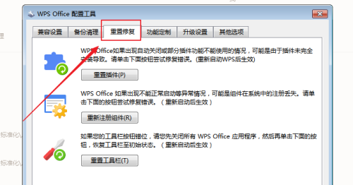 第五步:在弹出的WPS Office配置工具对话框中,点击分类中的重置修复。