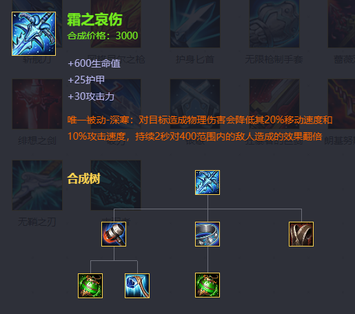 霜之哀伤是游戏魔兽争霸3中阿尔萨斯的手中利器;如同其名字,这是一把带着邪恶的强大力量,却又带着哀伤的悲剧色彩的神器。在300英雄中,该装备也是一把“冷若冰霜”的剑,不但可以提供攻击、血量、护甲,还可以在攻击敌人的同时使其减速,真的是名副其实的骑士剑。