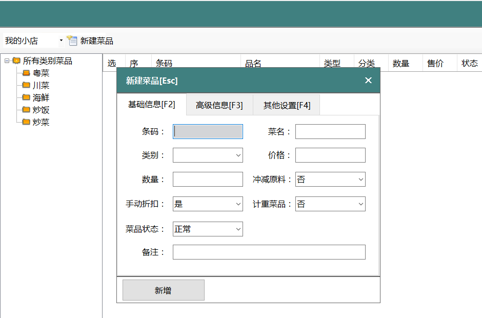 5、如图所示,这里是新建界面,输入条码、菜名、类别、价格、数量、冲减原料、手动折扣、计重菜品、菜品状态