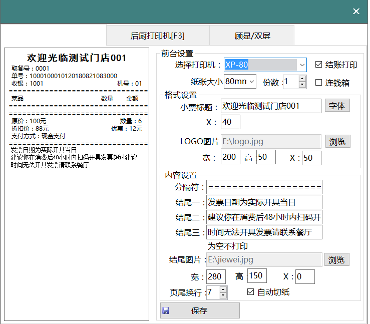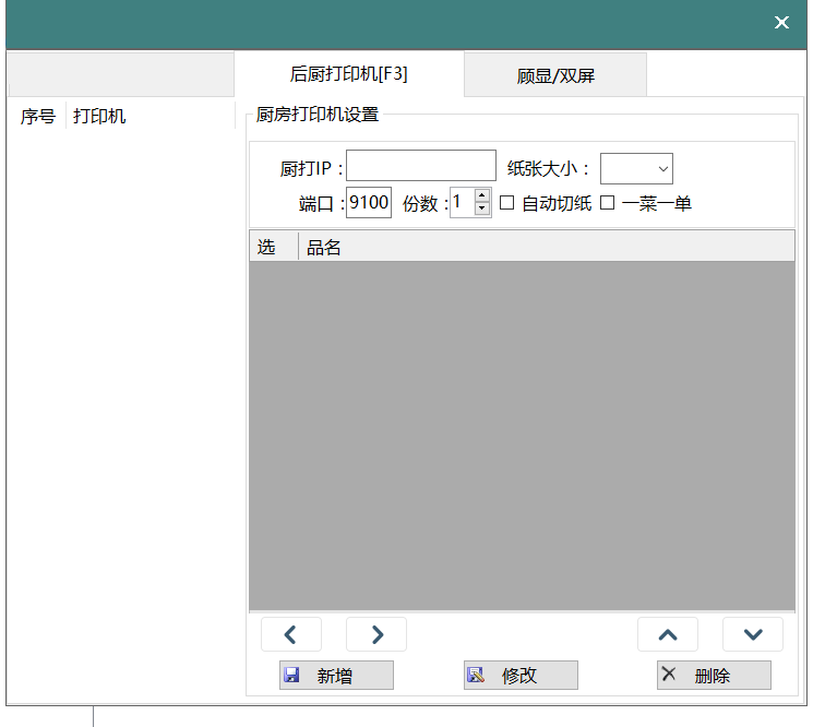18、后厨打印机设置,可以在这里添加打印机信息,可以直接在软件界面输入新的后厨打印设备IP以及纸张大小