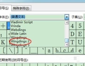 第三步:在弹出框的“字体”中,选择“Wingdings2”,下拉菜单拉到最后面就可以找到(如图所示)。