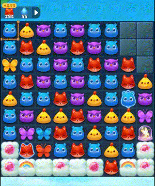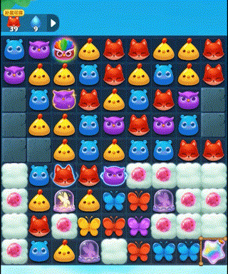 1,进入关卡的第一步,我们要交换魔力鸟,先把关卡的画面清屏消除一次,消除掉云团和毒液等图案,让动物进行更多的掉落来填充空位。