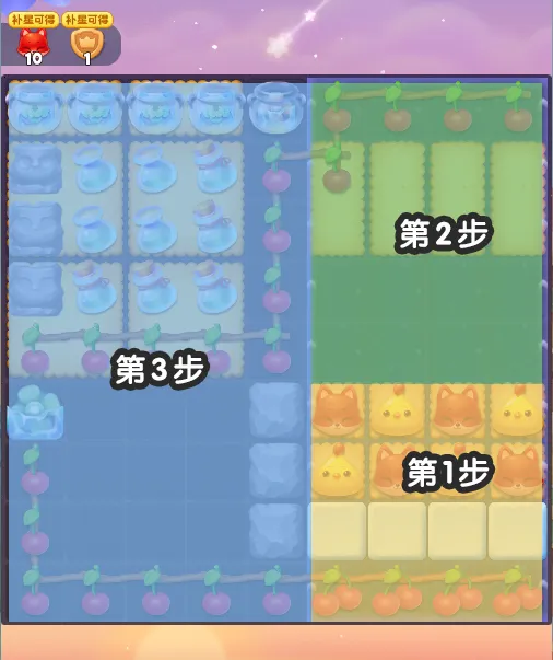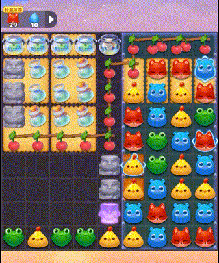 第二步,把上方的樱桃击打并让其掉落,然后组合直线特效等方式让你的步骤更加有效率。