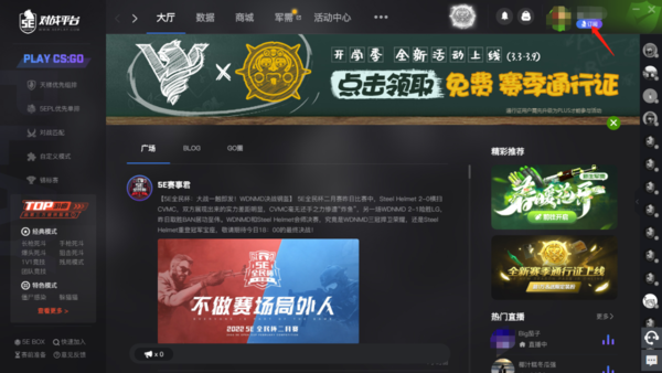 首先,我们登录5E对战平台,来到主界面。在主界面右上方,头像附近可以看到【订阅】按钮,点击即可跳转到通行证/PLUS订阅界面。