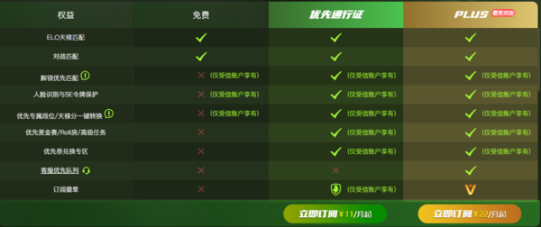 这里也说一嘴它的价格吧,毕竟性价比,既要看性能,也要看价格。首先是优先通行证,它的价格是11元/月起;而PLUS的价格是22元/月起。由此可见,价格并不是很贵,如果大家想享受更好的对战体验,那可以冲起来了!