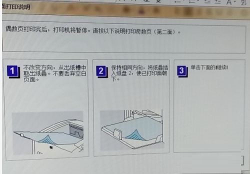 第三步:单面打印结束后,按照出纸的方向,保持原样装入纸盒,点击继续,进行双面打印(如图所示)。