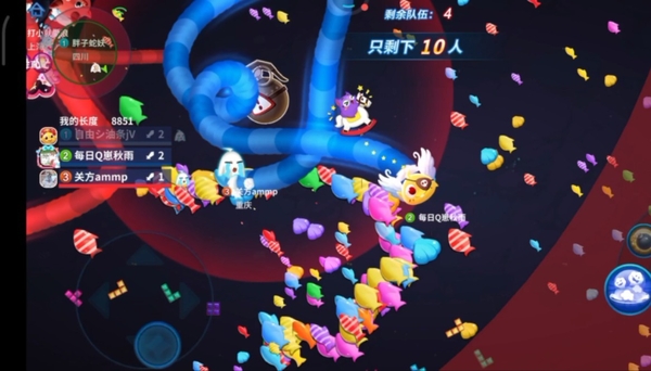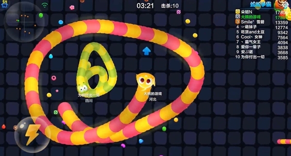 如果遇到和敌方快要撞到一起的时候,我们可以通过回转的方法为自己找到新的行进路线,那就是向外划出一个回转,然后再移开自己的头部位置,如果其他玩家在回头时没有掌握好方向就会被撞死,所以这个方法是非常适合配合着糖果诱饵来提高自己优势的。