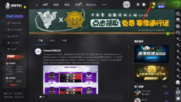 首先,我们成功登录5E对战平台,来到主界面;在主界面UI的右上方,可以看到我们自己的头像,点击进入个人资料页。