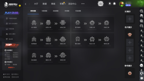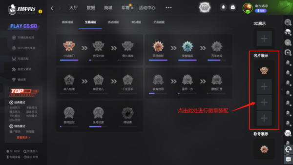 除此之外,在5E对战平台中,如果将勋章作为游戏中称号显示的话,方法与上述内容类似,只不过是点击下方“称号展示”进行修改。