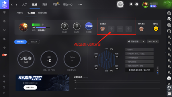 来到个人资料页后,我们可以在中间看到“名片展示”模块,点击模块所在位置,我们就可以进入5E对战平台的勋章界面。