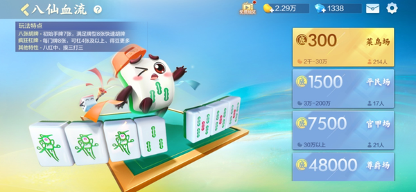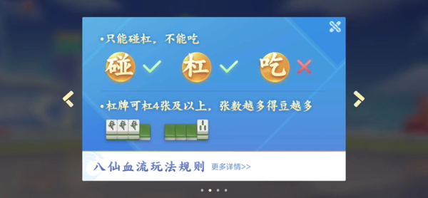 3,八仙血流玩法里不管是基础牌还是东西南北的字牌,每种牌都有八张,所以杠牌也不会再局限于四张了,可以多张杠牌,杠牌的数量越多,赢的游戏豆也就更多,而且杠牌的优先级是大于胡牌的。