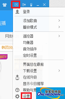 1:首先在酷狗软件右上角点击向下箭头,在弹出的对话框中选择设置。