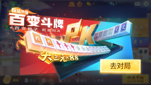 1,百变斗牌的玩法有单花色的赖,也就是条赖万赖和字赖,可以充当单花色的任意牌,游戏开始之前还可以进行天选换牌的操作,发完手牌以后,每一个玩家都可以选择任意张数的牌和系统进行随机的交换。