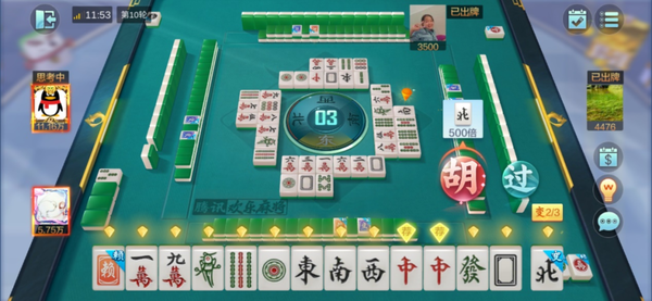 游戏中所有还没有认输的玩家都胡牌了,并且在特定的8轮以后,游戏就会进入到决胜时刻,每一次摸三张牌打三张牌,这个阶段是有机会同时胡三张牌的,并且还有可能触发特殊番型连中三元和三星高照。