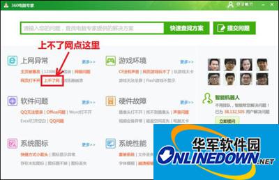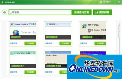 首先下载更新360安全卫士至最新版本,然后在主界面找到并点击“电脑专家”,这时,呈现在眼前的就是一个绿色的搜索框和不同电脑故障的分类,我们可以在搜索框中输入“上不了网”,360电脑专家就会快速查找解决方案。当然我们可以点击下方橙色的“上不了网”来选择不同故障的门诊解决方案。