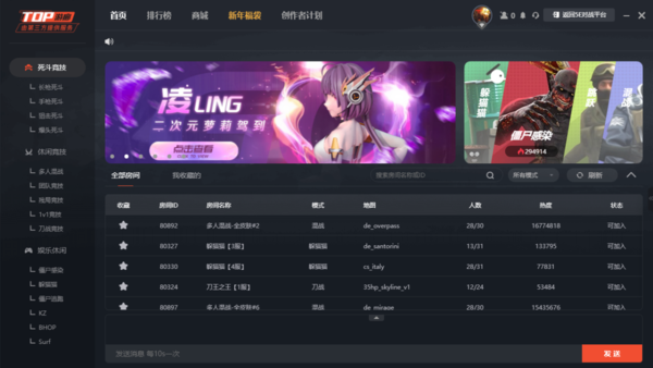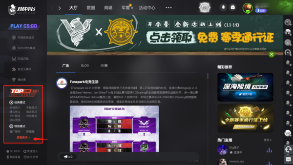 首先,我们打开5E对战平台,来到主界面后,可以看到主界面UI左侧模块栏中有一块是“TOP游廊”,这一块就是整个5E对战平台第三方服务器游玩的全部内容;我们可以选择里面的模式然后进入,或者直接点击“查看更多”,以进入“TOP游廊”界面。