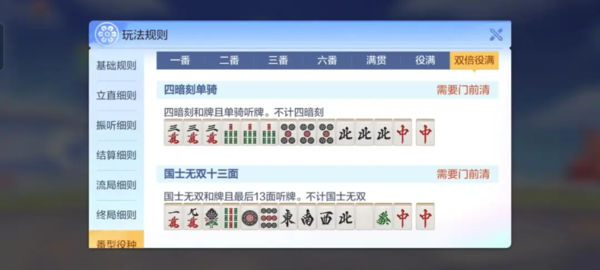 4,尽管在这种玩法中有多种役满番型和双倍役满番型,但是每一种难度都很大,所以在游戏时要充分了解自己的牌型组合,来合理的选对做牌的方向,如果感觉做大牌的概率低就要放弃,来选择难度低的牌型,这样才更容易胡牌获胜。
