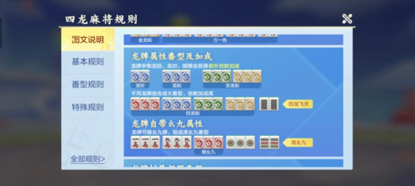 5,关于番型,因为这种玩法加入了龙牌,所以也就新增了龙牌的番型,用户要根据每一局获取到的龙牌数量来自由的选择做牌方向。