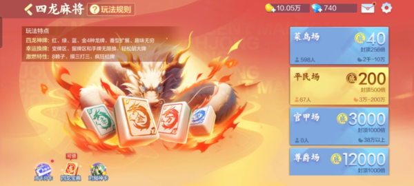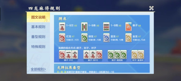 在腾讯欢乐麻将全集中有一种非常个性的玩法,叫做四龙麻将,在牌库中增加了红龙,绿龙,蓝龙,金龙四种牌型,其中红绿蓝龙分别对应着一种花色,也就是万字条子和筒子,可以当成对应花色的0点与10点来使用,比如说红龙可以和1万2万组成顺子一二三万,但是金龙是不对应花色的,需要根据自身进行组合,以上就是基本的规则了,下面给大家带来详细的讲解。