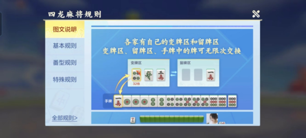 3,首先幸运换牌是说每一位玩家在参加四龙麻将的玩法时都会拥有专属的变牌区和存牌区,在变牌区中是有三张可以用来刷新的牌的,在存牌区一共可以存放三张牌,有需要的牌时可以先把牌放在存牌区,方便后续进行组合。