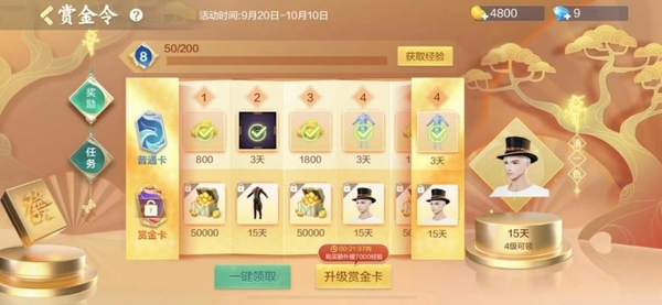 2,聪明的小伙伴已经发现赏金令是有两种类型奖励的,第一行有一些空位上是没有奖励的,第二行的奖励却十分的丰厚,因为第一行的奖励是普通玩家可以免费领取的,第二行是需要开通赏金卡才可以领取的,开通这个赏金卡以后,用户获得经验的速度也会更快,领取的奖励也更多。