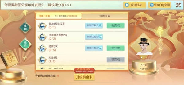 1,大家注意看,在主界面的左侧就有赏金令的入口了,点击之后就可以领取更多的欢乐豆,不过需要完成每日任务和每周任务来获取经验,才能够提高自己的赏金令等级,等级越高,越可以领取更多的丰厚奖励,不同的等级对应的奖励是不一样的哦。