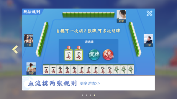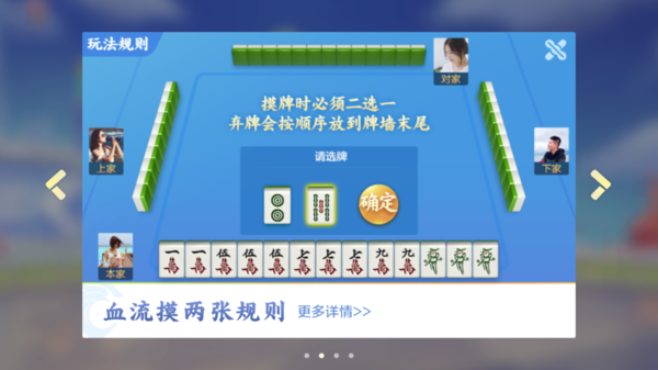 摸两张的玩法其实就是在血流换三张的玩法基础上又增加了摸牌二选一的规则,在定缺牌型以后,每一轮的玩家都要在两张牌中选择一张放到手牌里,没有选择的牌会按照先后的顺序依次放到牌墙末尾,全程只可以碰牌,杠牌,但是不能吃牌。