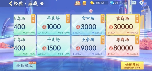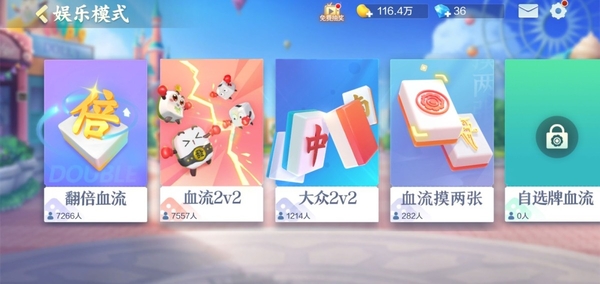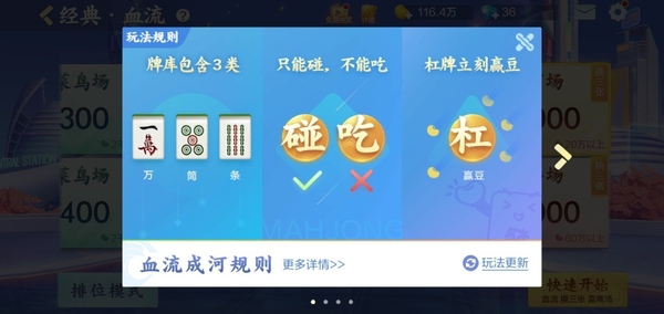 2,小编提醒大家,这种玩法要定缺一门才能够胡牌,在特殊规则中还有退税、查花猪和查大叫三种惩罚方式,具体的玩法上又有经典血流、翻倍血流和血流摸两张的玩法,其中血流摸两张和翻倍血流是在娱乐模式里,大家可以仔细寻找一下。