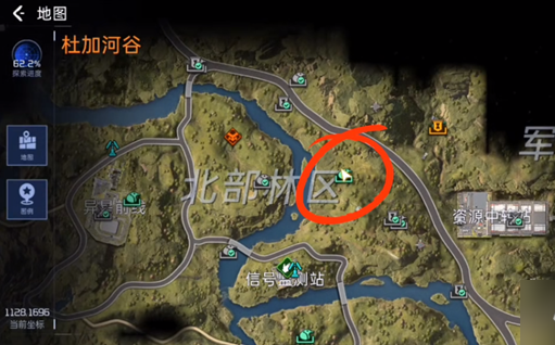 1、第一步,用户先要前往北部林区这个区域,也就是图中红色圆圈的位置,因为这里是有一个信号塔装置的,我们要在这里进入任务。