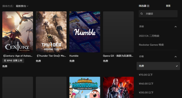 比如我们点击了【免费】分类,此时Epic游戏平台的商城就会显示出所有的免费游戏,我们在这里继续挑选自己喜欢的游戏即可。