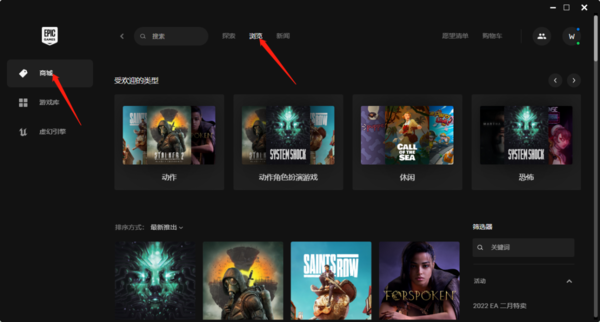 我们打开Epic游戏平台,进入【商城】界面,然后点【浏览】模块,这就是Epic游戏平台商城的主体。