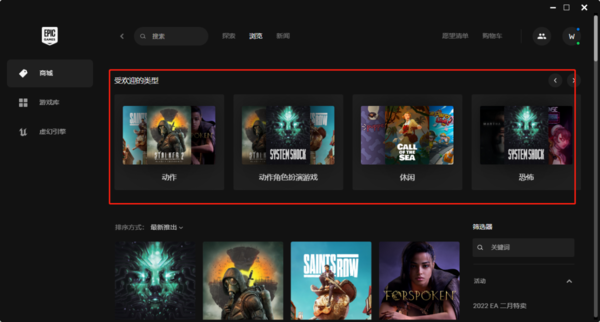 1、最受欢迎的游戏类别。这也是挂在Epic游戏平台游戏商城最上方位置的分类,大家在进入商城时,一眼就可以看到;如果是喜欢热门游戏的小伙伴,打开这些分类,一定可以找到属于自己的惊喜。