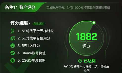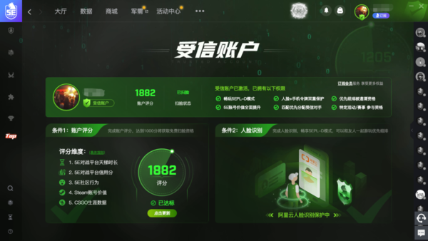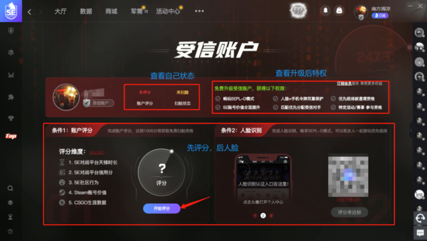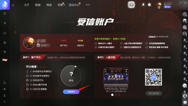 自打CSGO国服开始免费,国服官匹的质量略有下降,从而导致越来越多的CSGO玩家,开始选择5E对战平台,而5E对战平台也是越做越好,不但让玩家可以享受128tick的服务器,更有受信账户,让玩家不但拥有更高的游戏质量,匹配的玩家也都是绿色安全的,从而免受作弊及各种违规游戏行为的干扰。相信大家看到这里已经想知道5E对战平台受信账户如何申请了;这里则与大家一同分享PC版5E对战平台受信账户申请的操作流程。