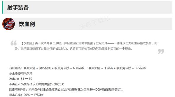 1.射手装备改动最大的特点就是:攻速装备的攻速数值给的很多,暴击装备的暴击率统一都是25%,整体来说改动的装备被动数值都比较不错。