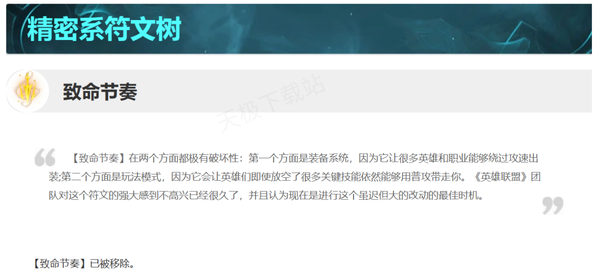 a.致命节奏、过量治疗、传说韧性移除;新增传说急速(永久提升CD缩减)、吸收生命力(击杀单位回血)。