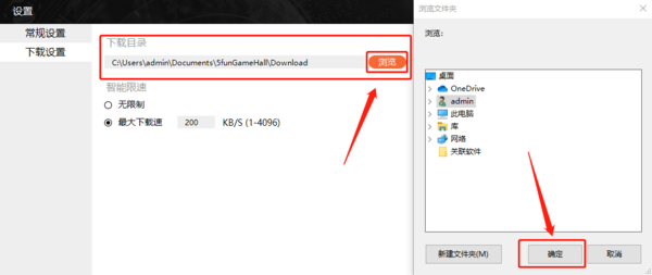 同样是在下载设置窗口,点击下载目录栏右侧的“浏览”键,在弹出的窗口中,重新选择文件夹来保存下载的游戏,再点击“确定”键就更改完成了。