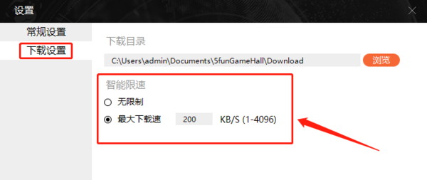 跳转弹出设置窗口后,选择“下载设置”选项,在智能限速中,可以选择“无限制”或者是自定义设置最大下载速度。如果勾选的“最大下载速度”,就需要设置最大网络值,大家可以根据自身的网络情况进行设置,最大可设置为4096KB/S。
