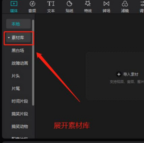 第二步:在开始创作的新项目空窗口,可以看到最左侧有一个“素材库”选项,单击可以展开“素材库”,可以看到素材库中有很多分类。