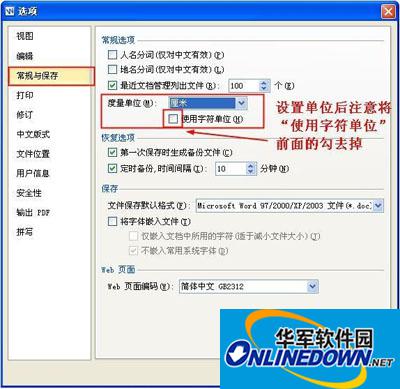 2、在“选项”—“常规与保存”—“度量单位”中进行单位选择,注意:不要被已经填好的"厘米"蒙骗,其实在它的下面勾选了“使用字符单位”的选择项,现在把这个小方框中的勾去掉,加以确定,就可以了。