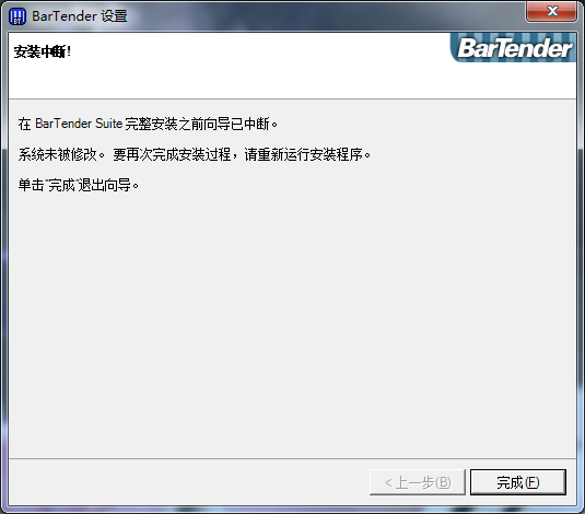 点击上图中“确定”,等待一段时间,会弹出安装中断窗口,点击“完成”退出BarTender10.1的安装,然后以管理员身份运行进行安装BarTender;若是还出现这样的安装问题,只能重装系统,再来一遍。